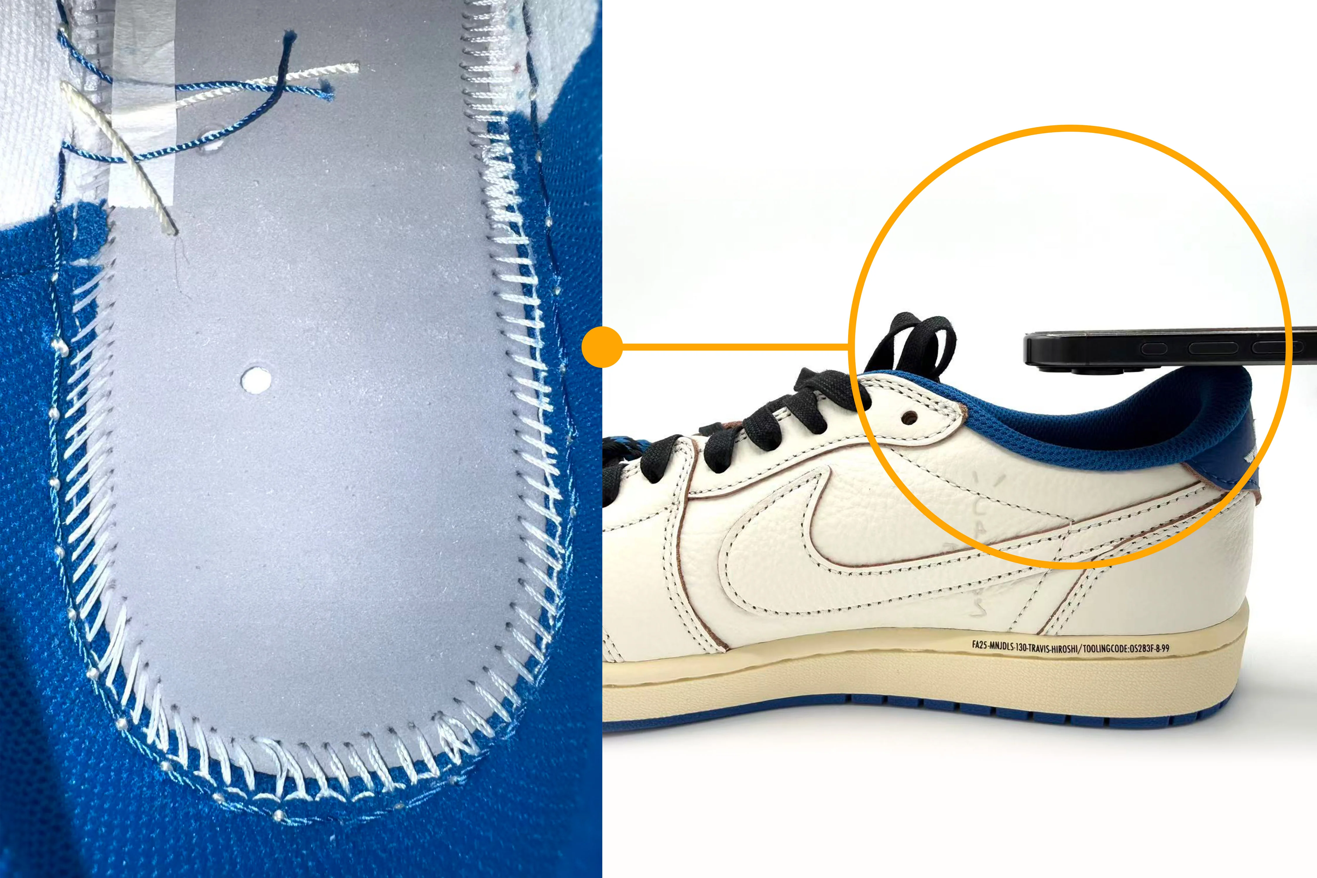 請將手機盡可能貼近球鞋,並對焦於中底縫線的位置進行拍攝。